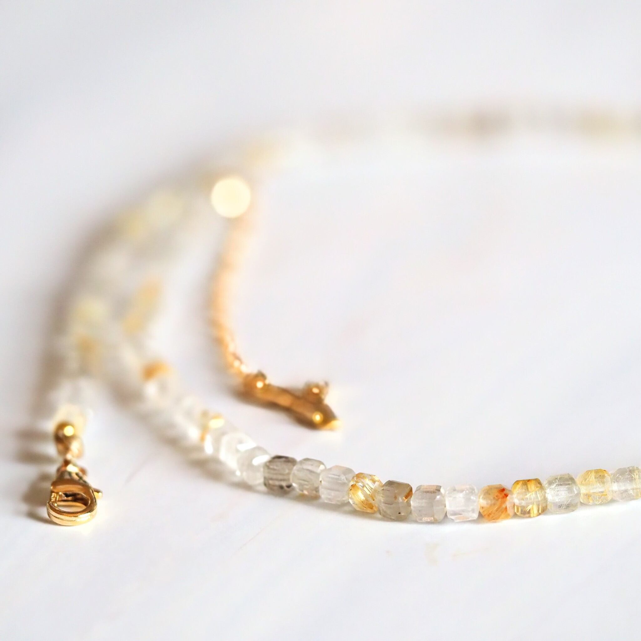 透明〜ゴールド色のルチルが首元でキラキラと輝きます。