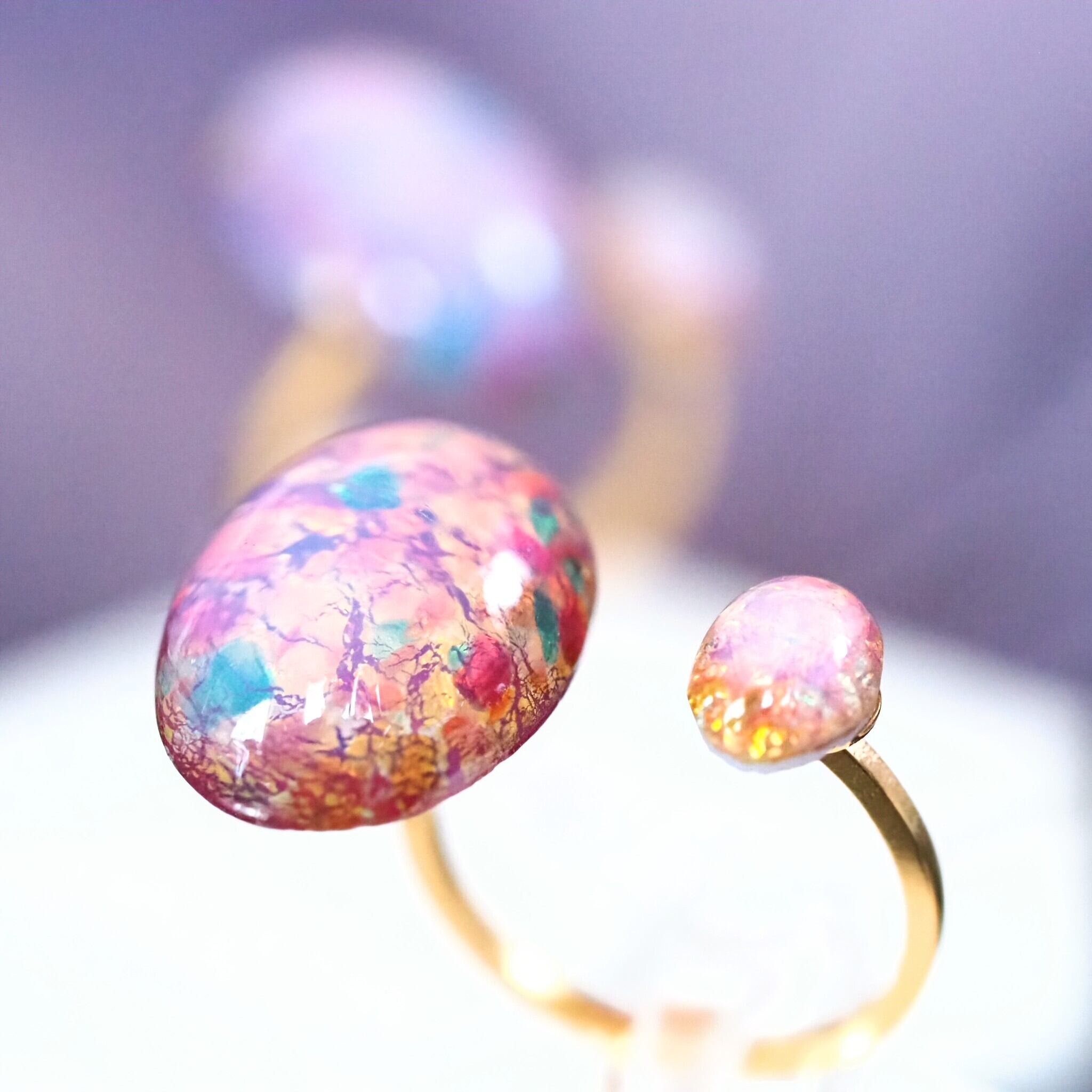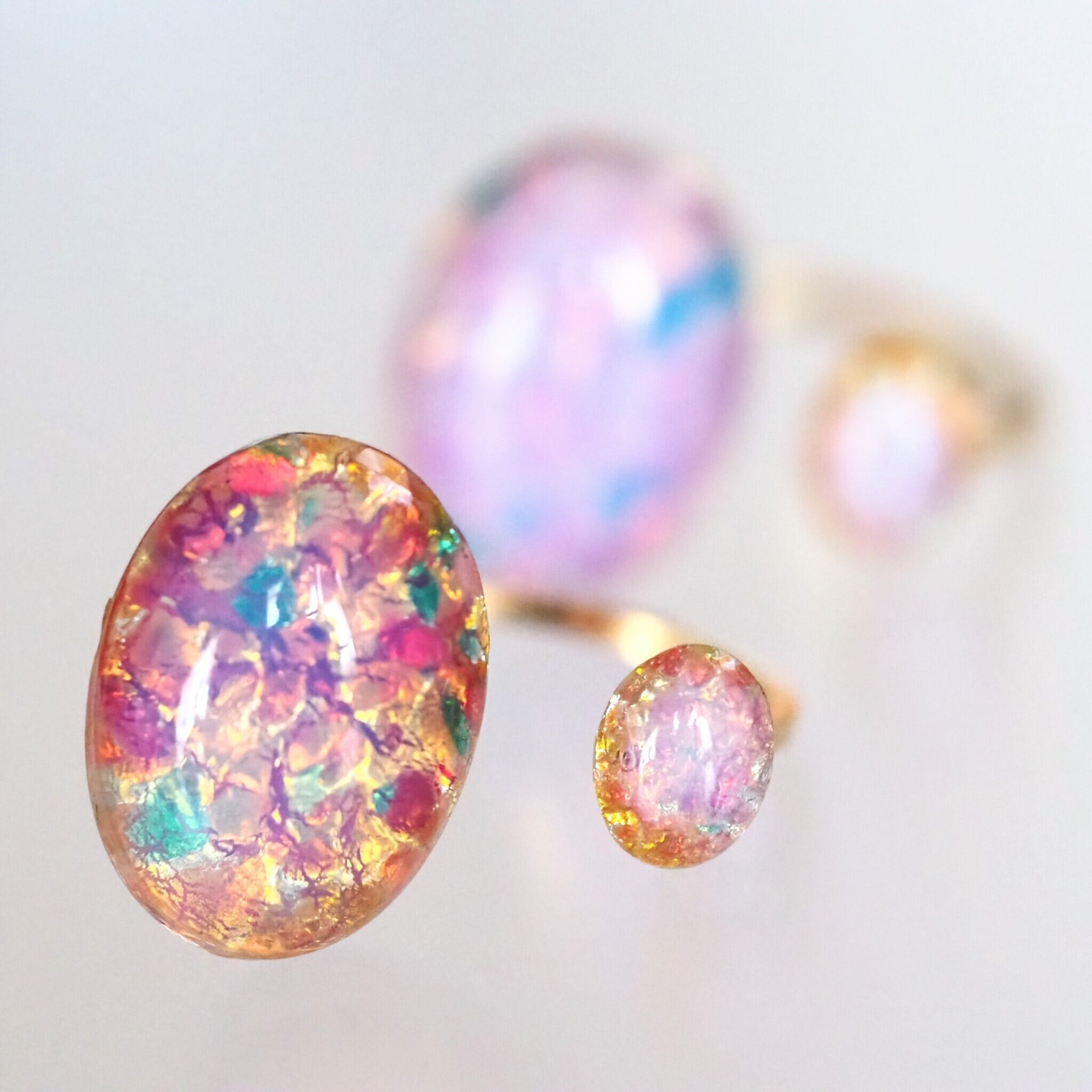 チェコ産のヴィンテージガラスでつくられた鮮やかな大小のファイアオパールを使用したフォークリングです。