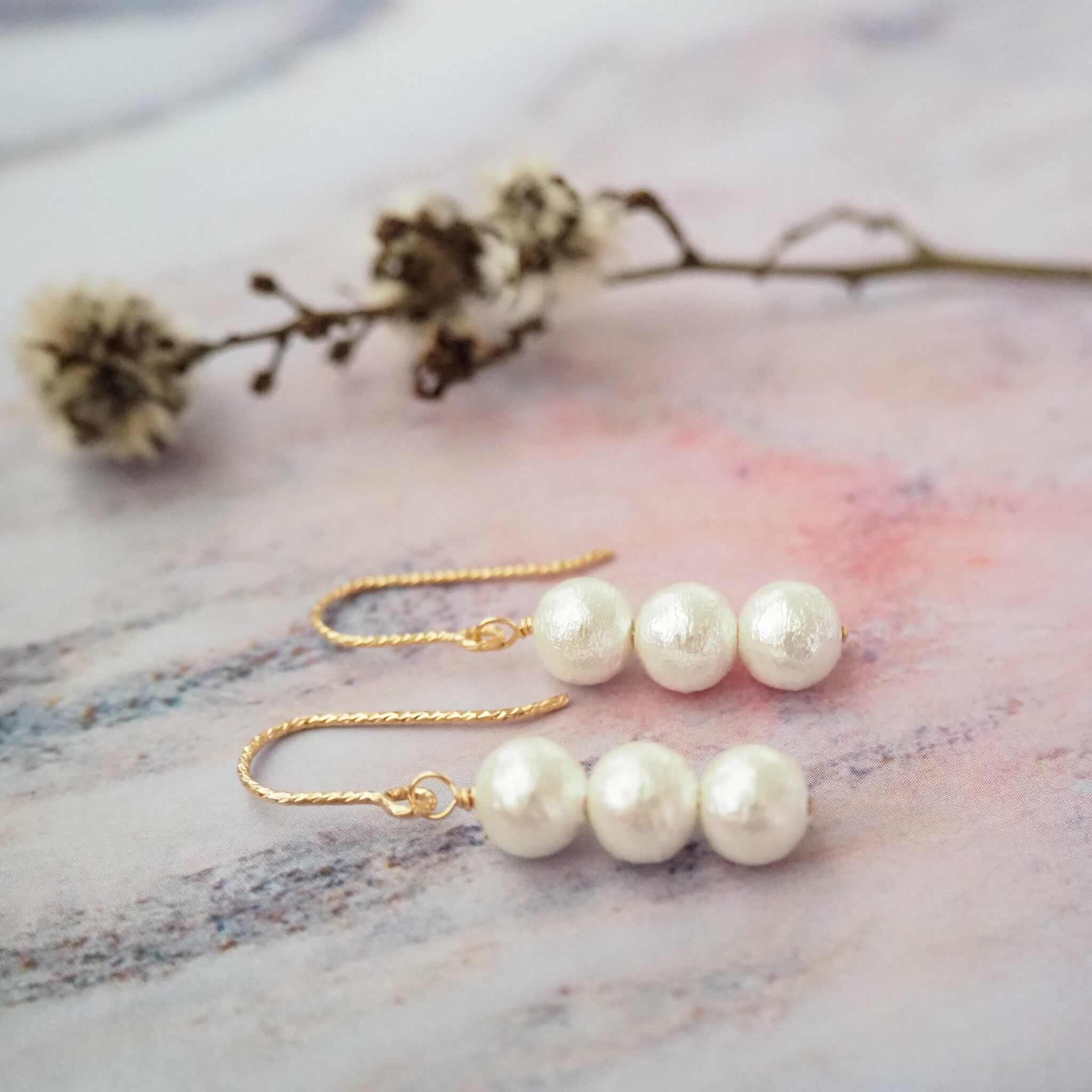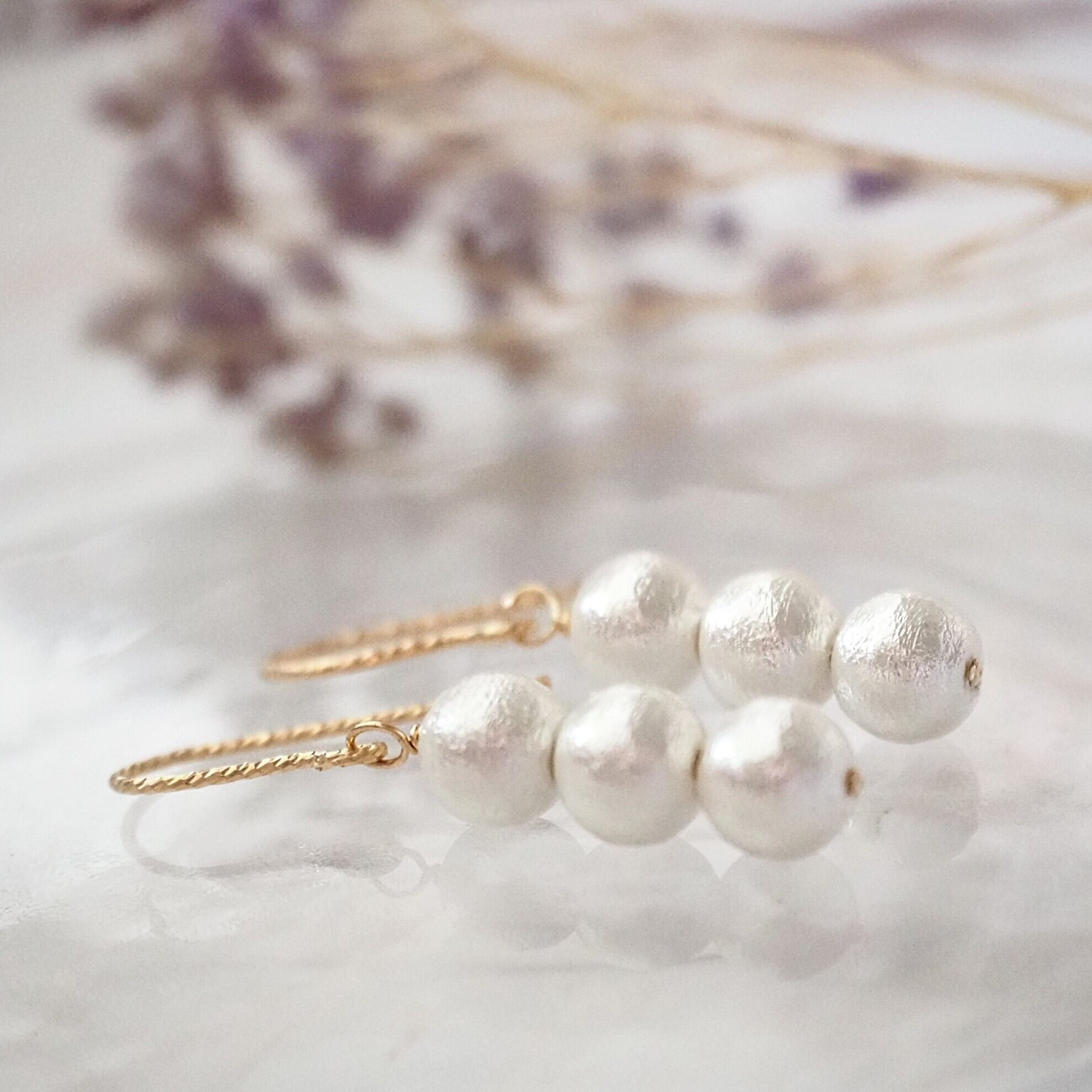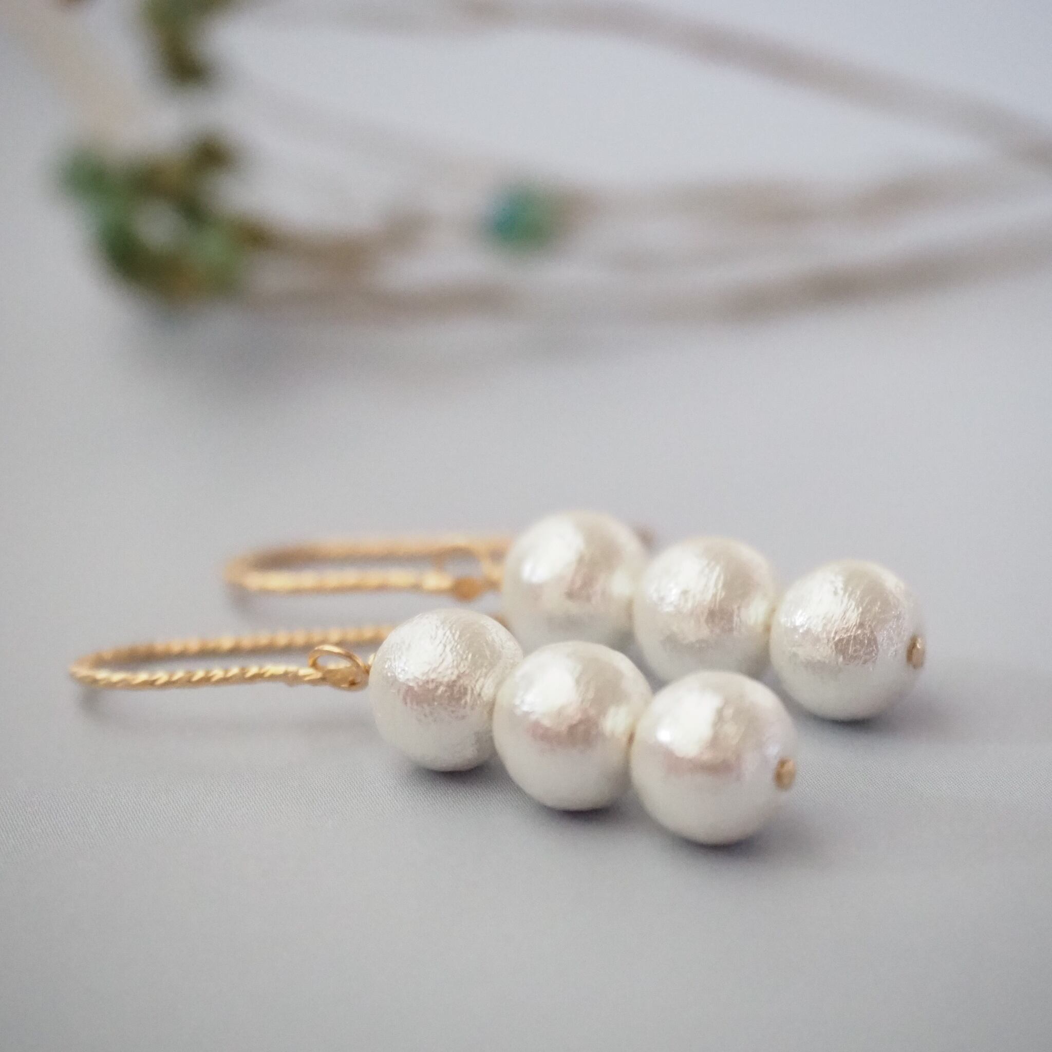 新興真珠が生産する「SHINKO Cotton Pearl」ブランドの正規品国産コットンパール6㎜を3つずつ使用したピアスです。