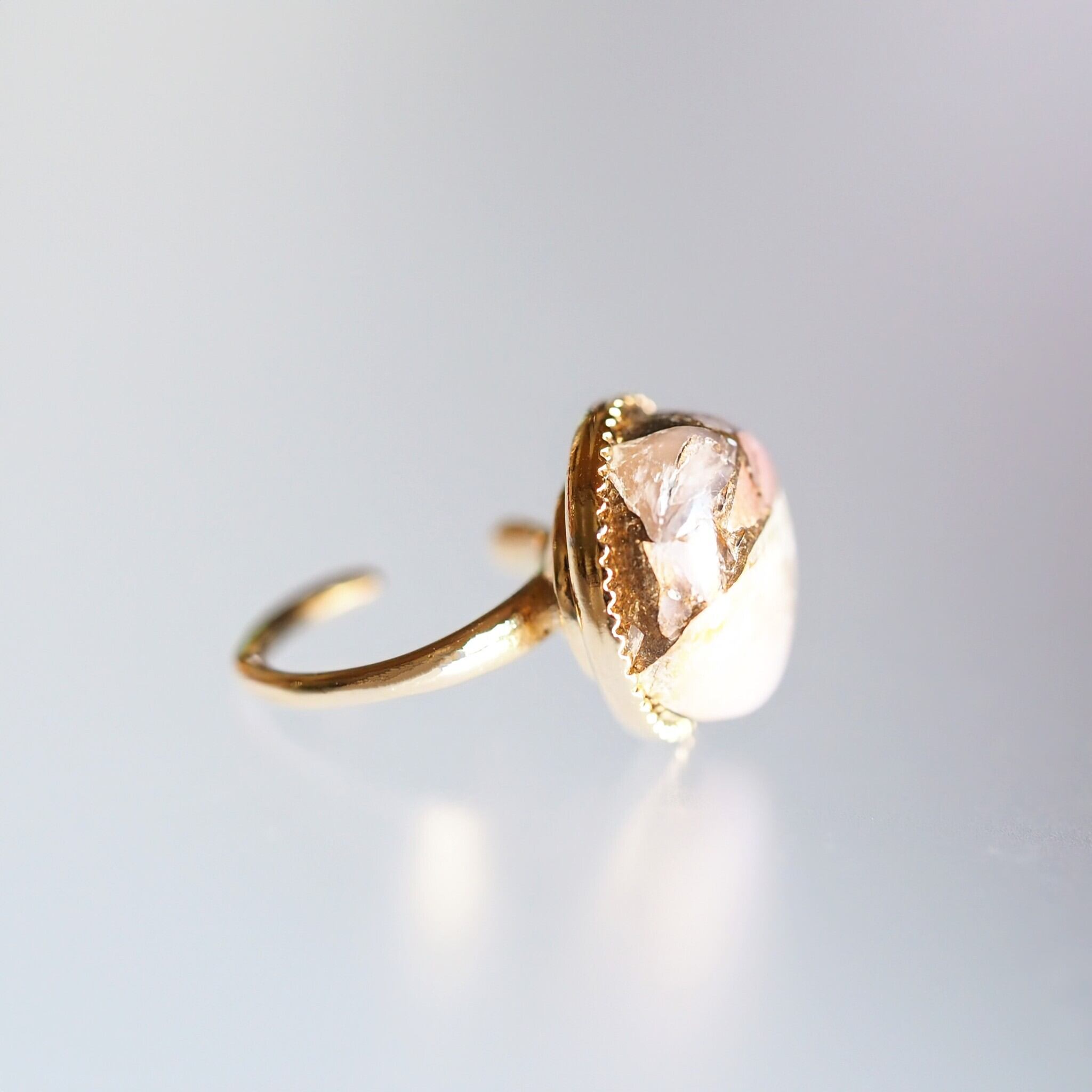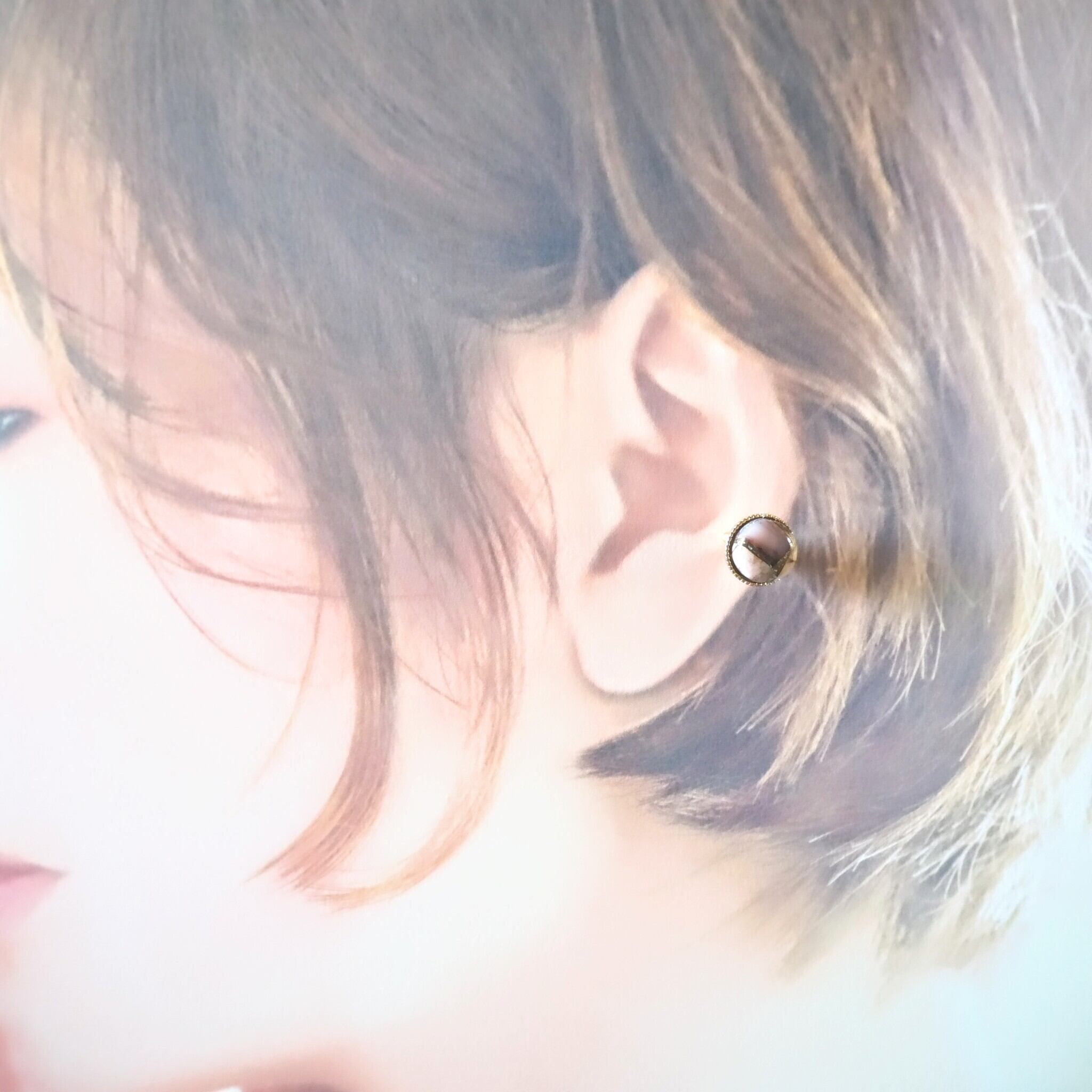 煌めくゴールドのミール皿に10㎜のラウンドカボションを合わせたイヤーカフです。