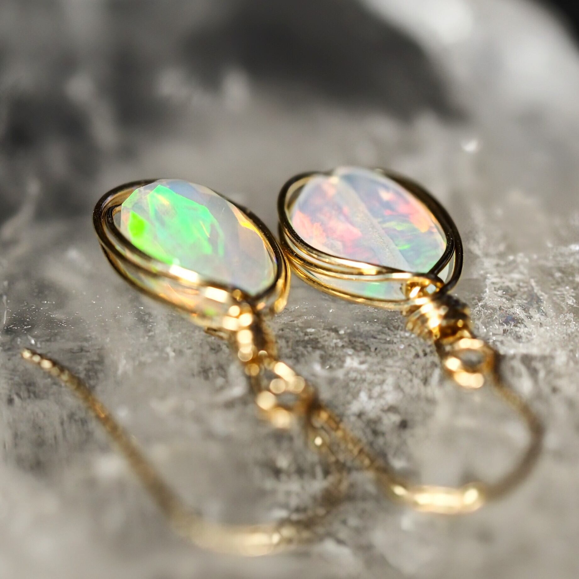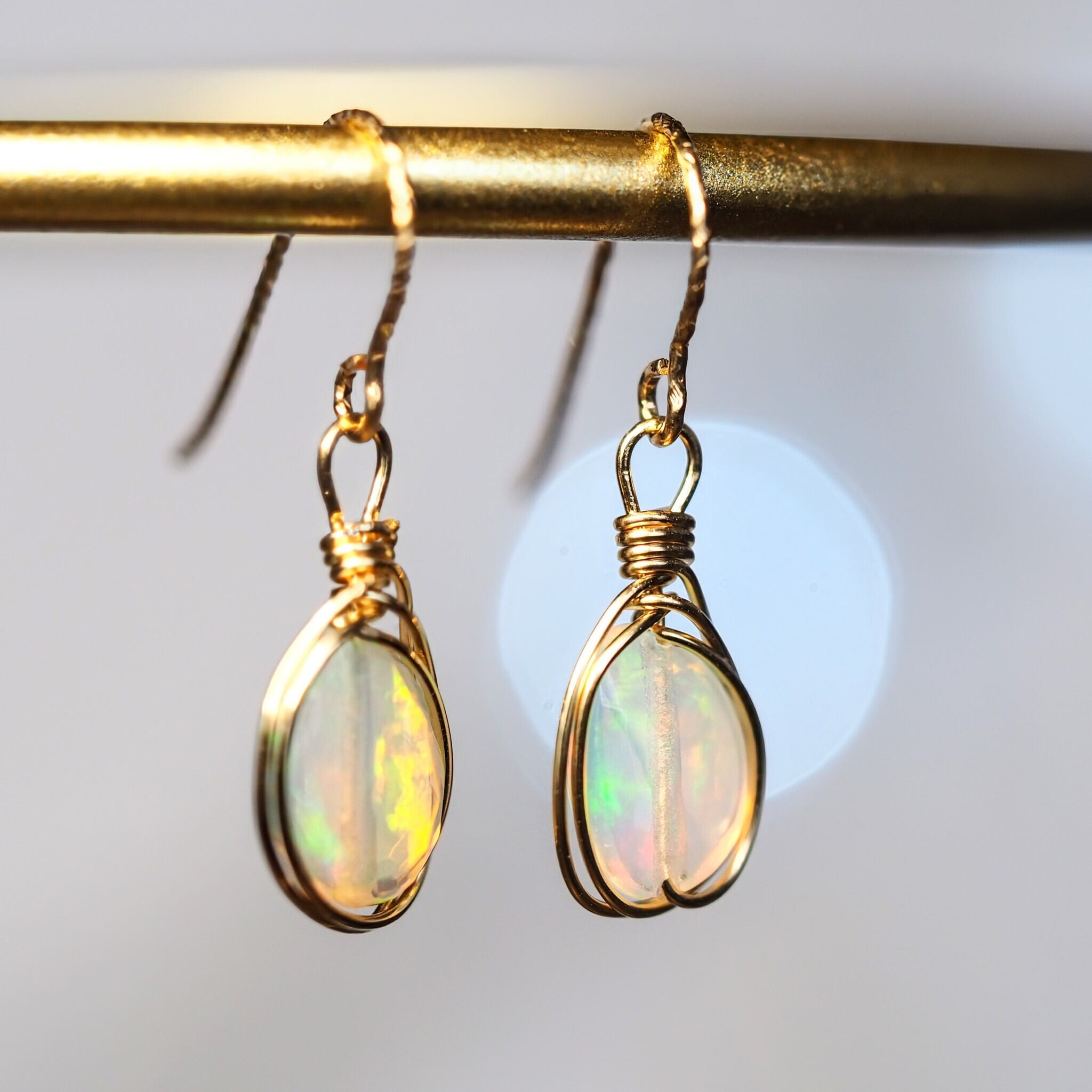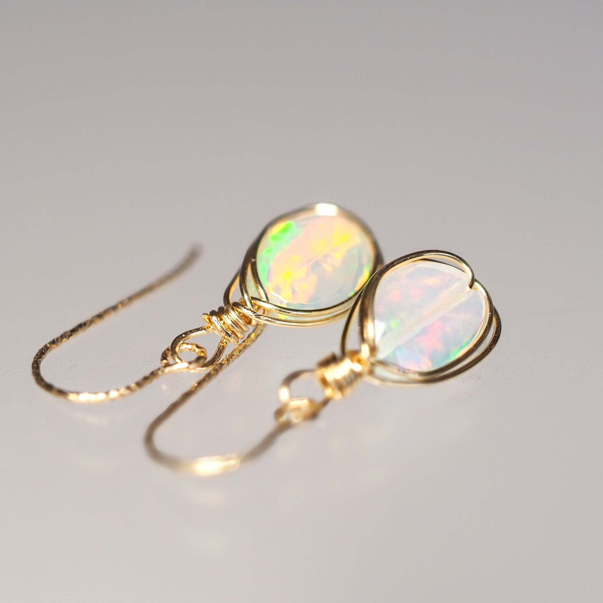 エチオピア産のプレシャスオパールを細めのワイヤーで囲んだ華奢なピアスです。