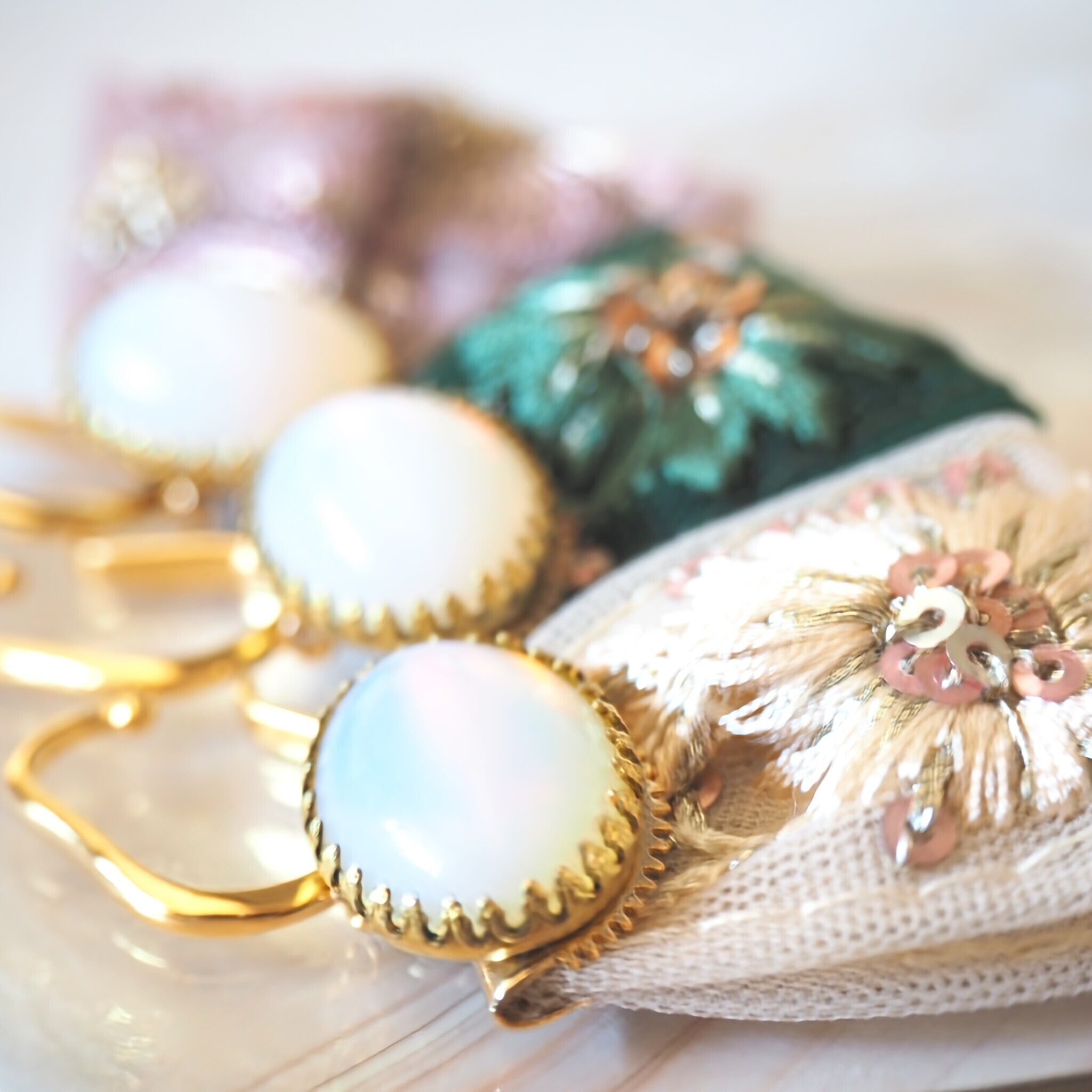 華やかなインド刺繍リボンを引き立たせるため、優しい色合いのオパールガラスカボションを組み合わせました。