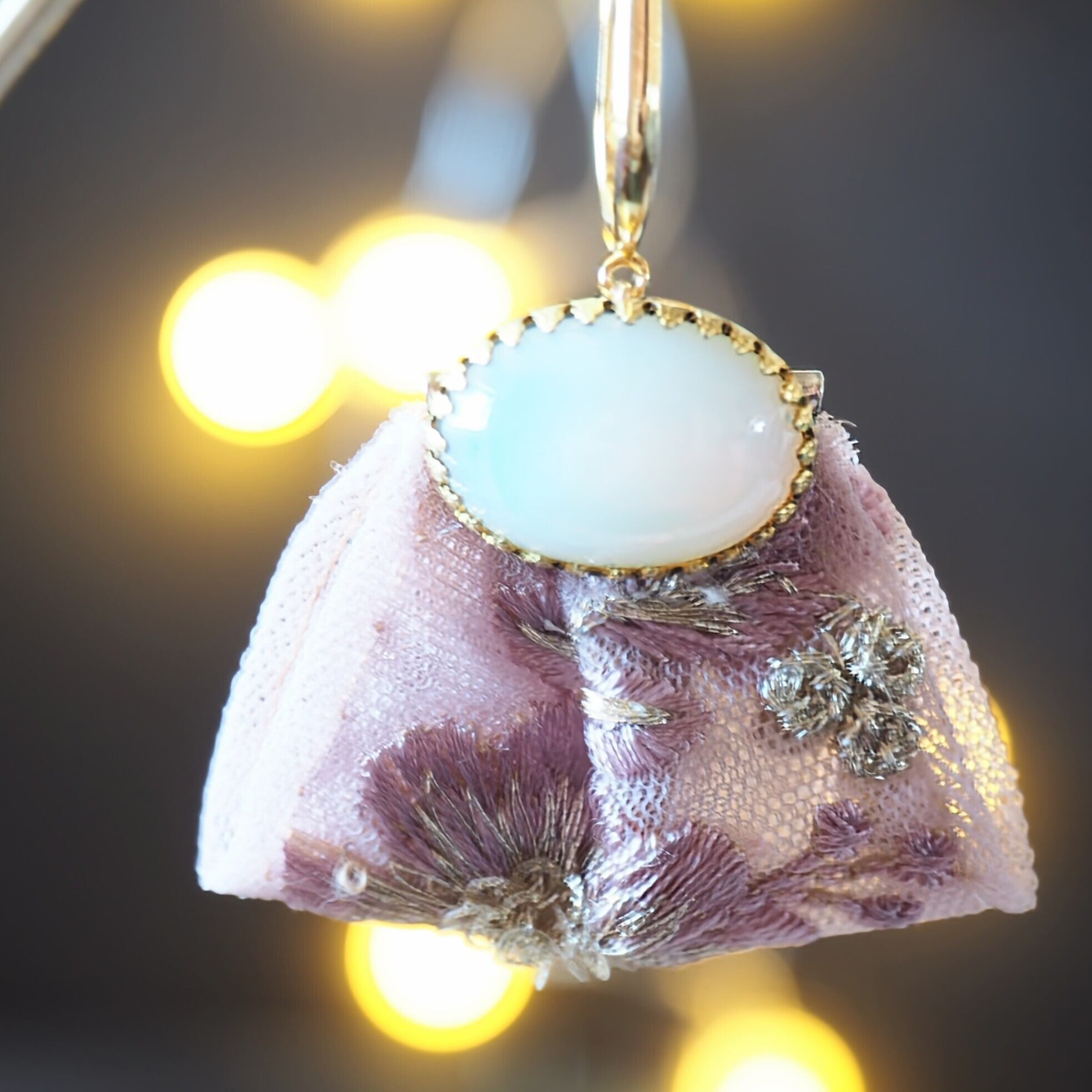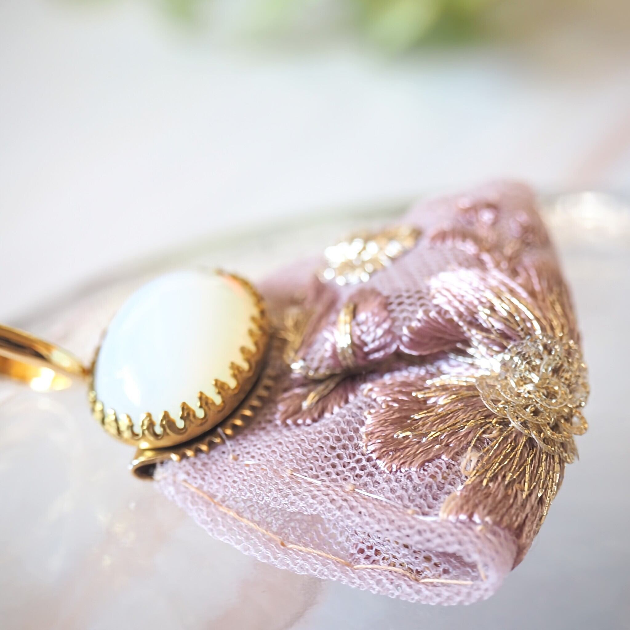華やかなインド刺繍リボンを引き立たせるため、優しい色合いのオパールガラスカボションを組み合わせました。